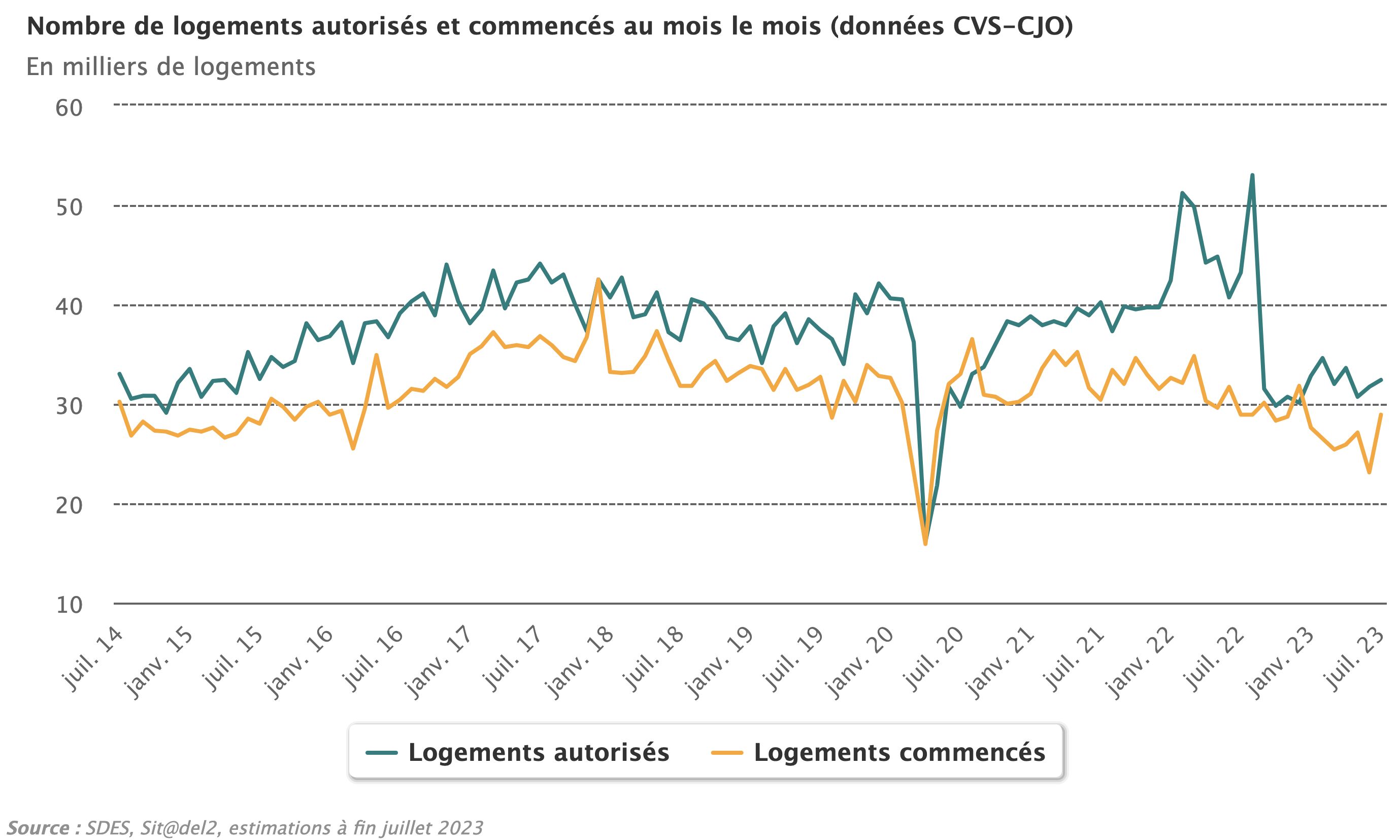 Malgré un léger frémissement enregistré au mois de juillet, tant en termes d'autorisations que de mises en chantier, la construction de logements neufs apparaît en net recul par rappor