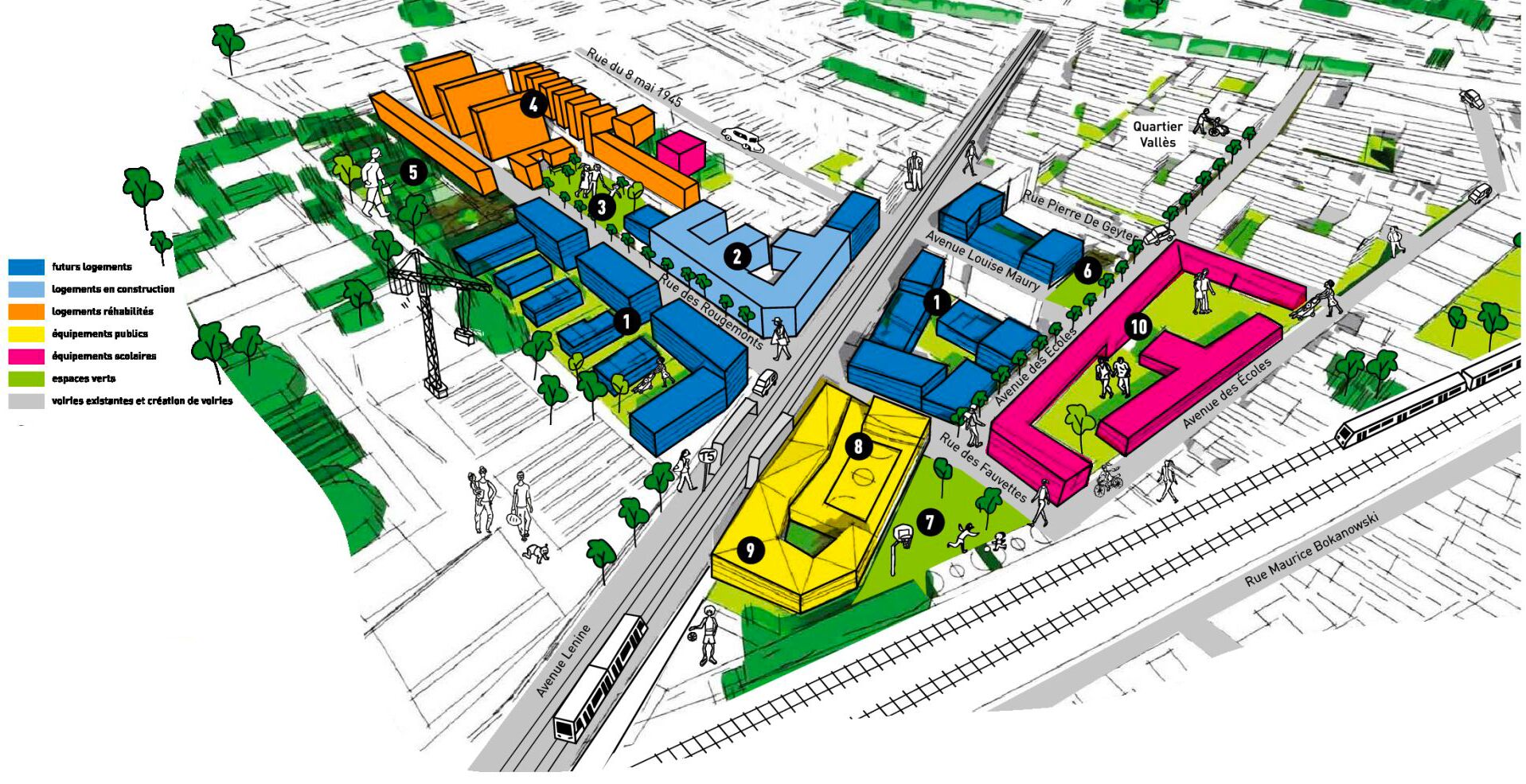 Les études pré-opérationnelles menées par le groupement de l’Atelier 2/3/4 font état de 21 000 m² d’espaces publics à requalifier et de 8 500 m² à créer. La SPL Plaine Commune Développement a décidé de confier leur aménagement au groupement de maîtrise d’œuvre emmené par